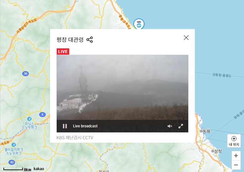 - 지도에 표시된 CCTV 아이콘을 클릭하면 선자령 실시간 CCTV 영상 확인 가능