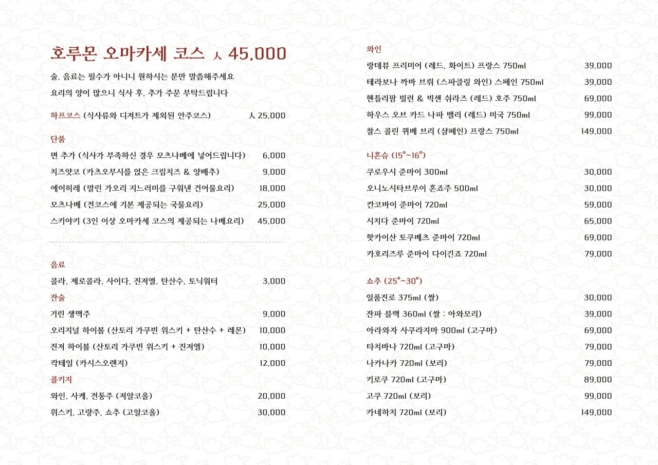 - 소내장 오마카세 (1인) – 45,000원
