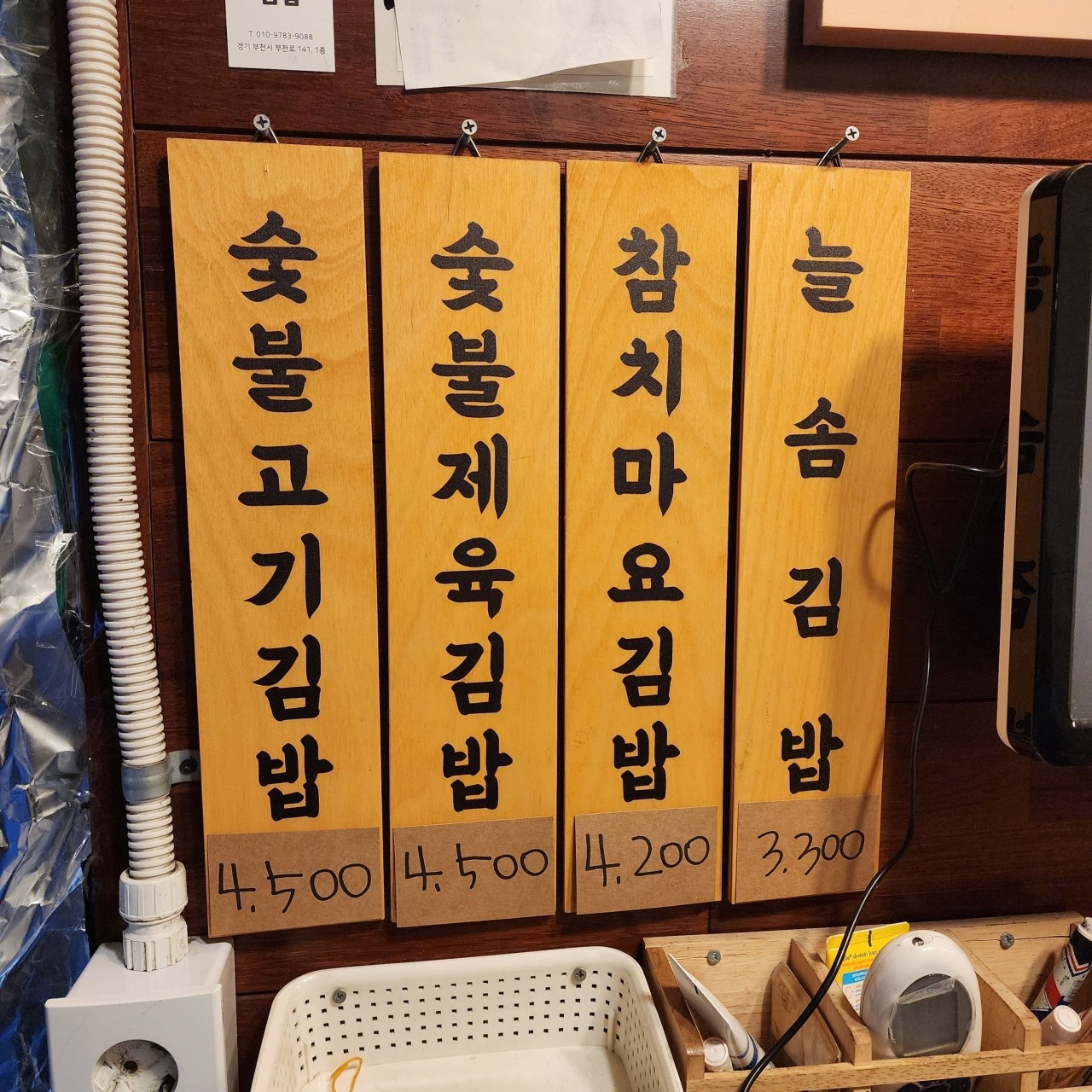 - 대표 메뉴: 생활의달인 숯불 제육 김밥, 숯불불고기김밥, 계란김밥, 늘솜김밥, 참치마요김밥