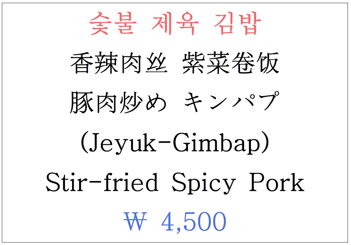 다른 메뉴도 훌륭하지만, 이곳을 방문했다면 꼭 생활의달인 숯불 제육 김밥부터 드셔보시길 추천합니다.