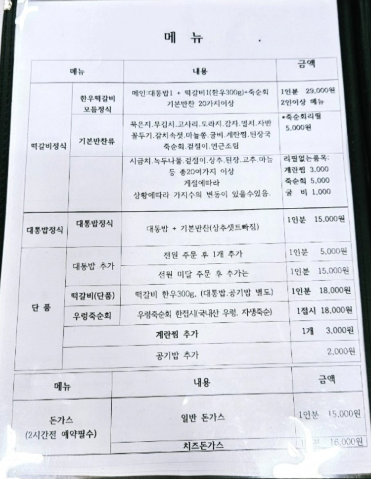 - 예약: 대통용찜은 하루 전 예약 필수 (4인분 이상, 선금 필요)