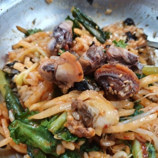 갓 지은 솥밥 위에 올라간 통통한 꼬막, 그리고 한 점씩 꿰어 구운 낙지호롱,