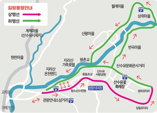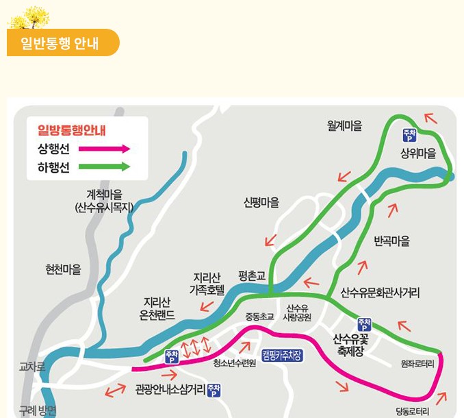 구례산수유축제는 매년 많은 방문객이 몰리는 만큼 교통이 혼잡하며, 일부 도로는 일방통행으로 운영됩니다.